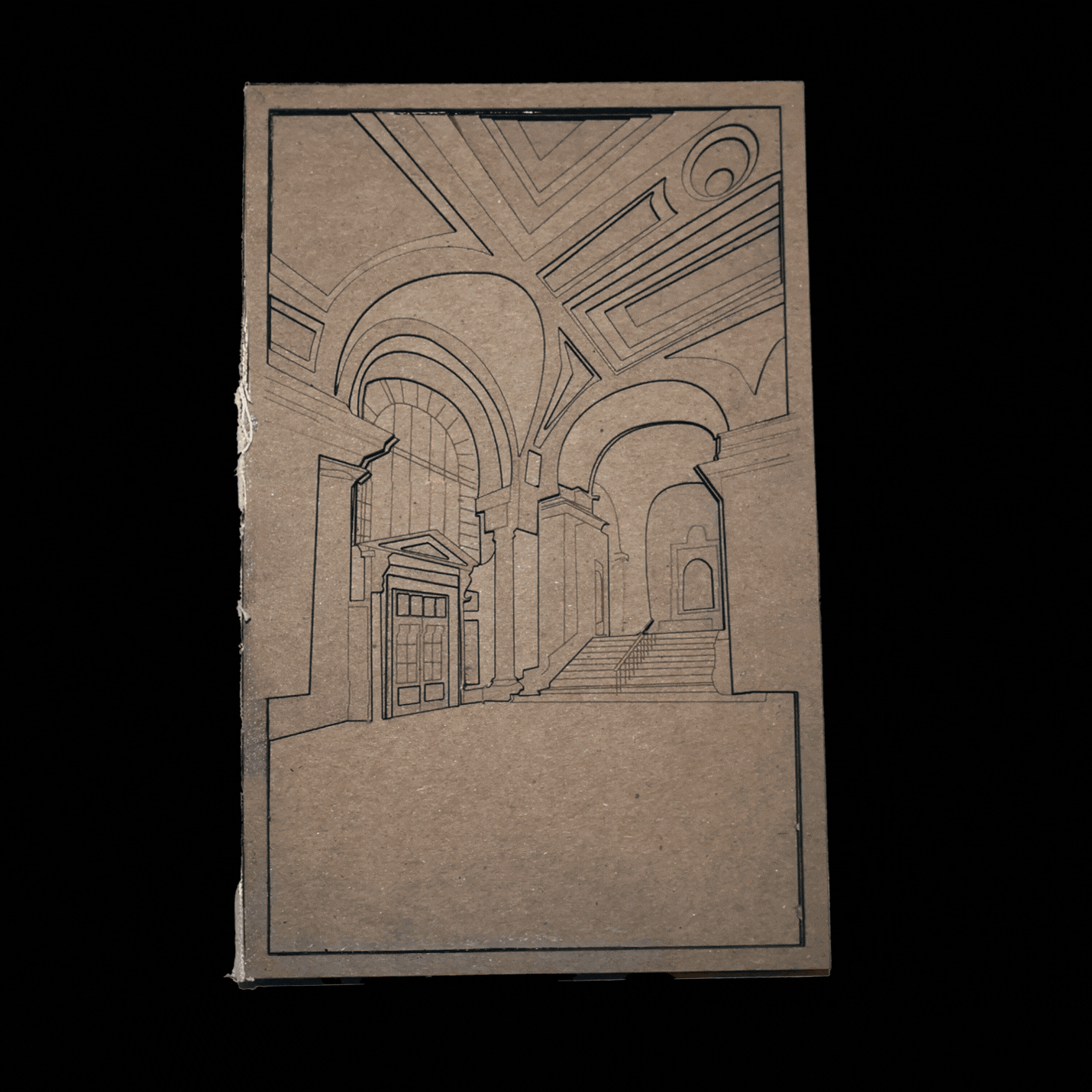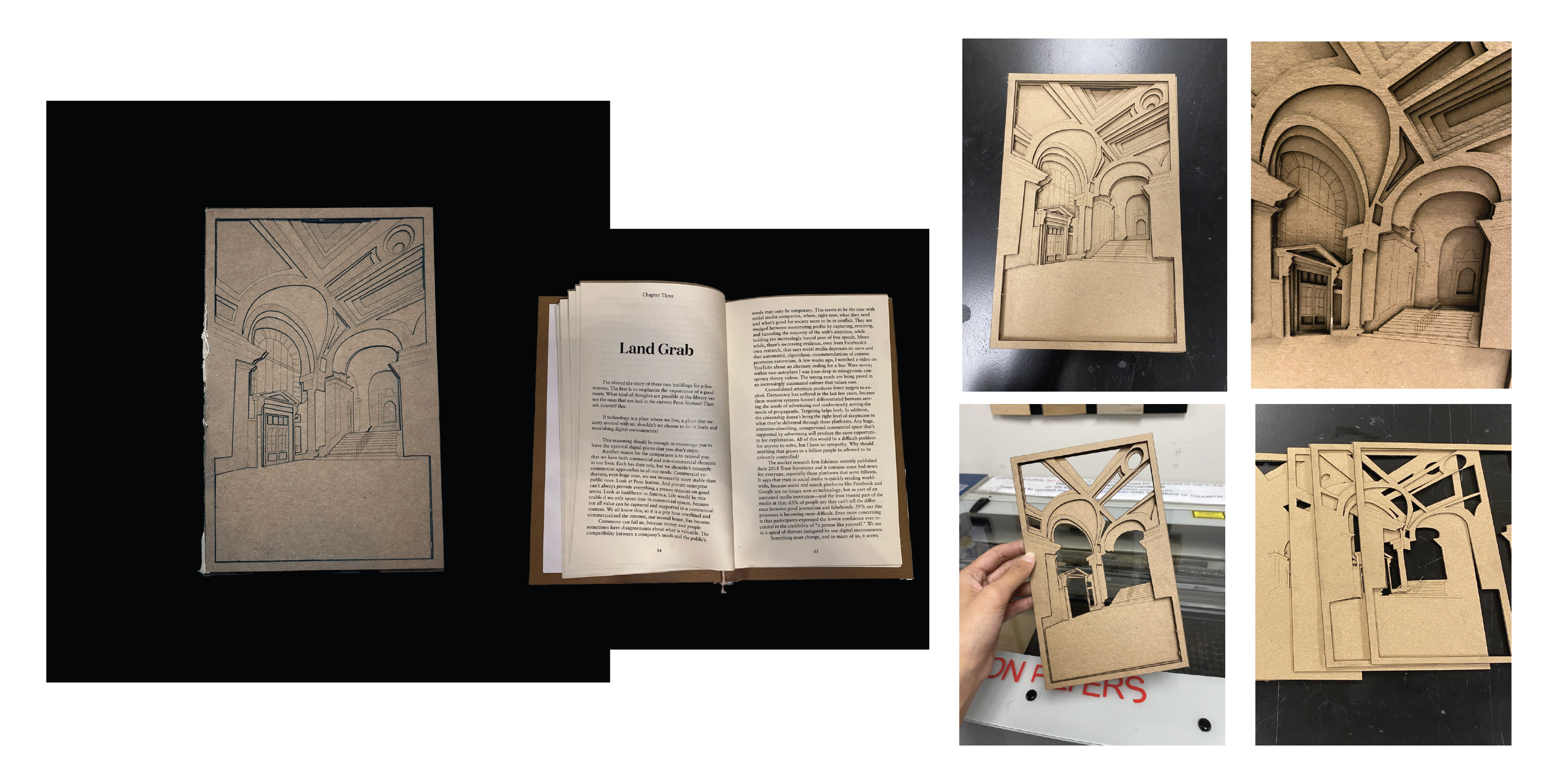 This printed publication may seem out of place, but the text I'm circulating is "The Good Room", written by Frank Chimero. This text speaks on the disppearance of the handmade web, correlating with the disappearance of third spaces and beautiful architectural complexities. The cover is the New York Public Library, cut with a laser cutter.